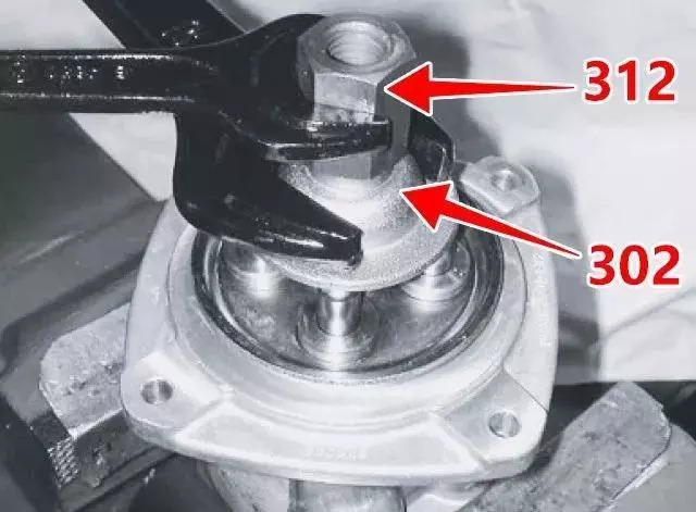 1、在先導(dǎo)閥各端口堵上堵頭后清洗先導(dǎo)閥,拆下防護(hù)罩的同時(shí)用扳手分別卡住調(diào)整螺母(312)和圓板(302),將螺母拆下來后,取下圓板。