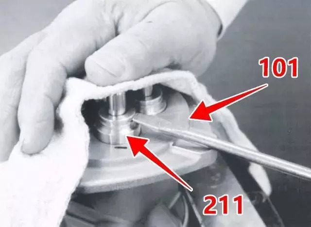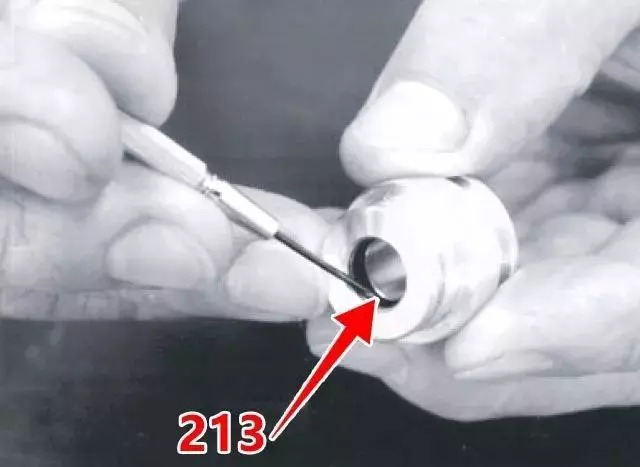 3、依次從殼體內(nèi)拆下推桿(212)、堵頭(211)、減壓閥總成(閥芯)、回位彈簧(221)。