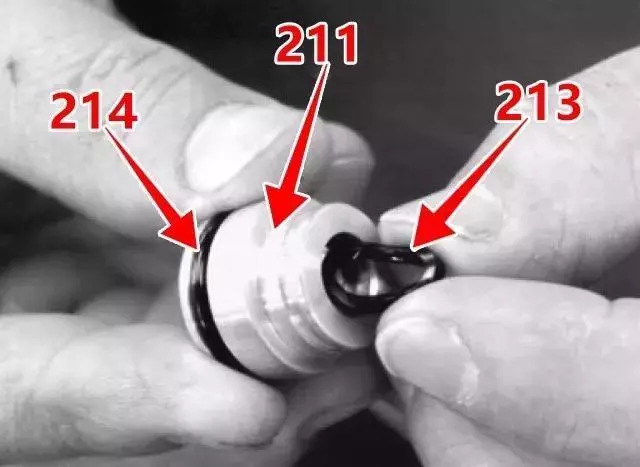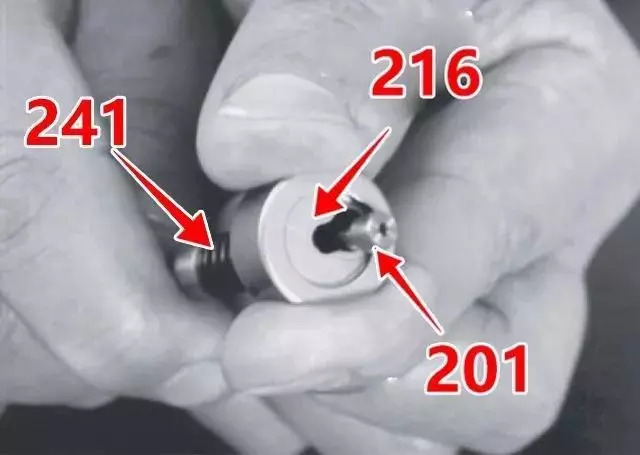 4、壓縮彈簧座(216),按壓彈簧(241),使閥芯(201)的頭部穿過彈簧座的打孔,將其拆下。